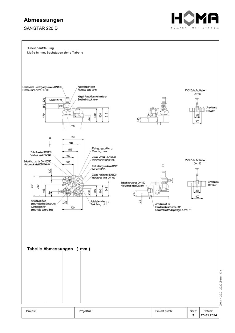 DN 80/DN 100, Zuläufe DN 40/DN 100/DN 150, Freistromrad, freier Durchgang 45 mm Ø , 1450-2900 U/min, Laufrad aus Stahlguss, Laufrad aus Grauguss, Pumpengehäuse und Sammelbehälter aus Kunststoff, Behälter mit 2 Pumpen, Kugel-Rückflussverhinderer, elestisches Übergangsstück, Anschluss-Kit Druckleitung, pneumatische Niveauschaltung, Standard-Steuergerät, Kabel-Pumpe 4 m, Steuergerät 0,8 m