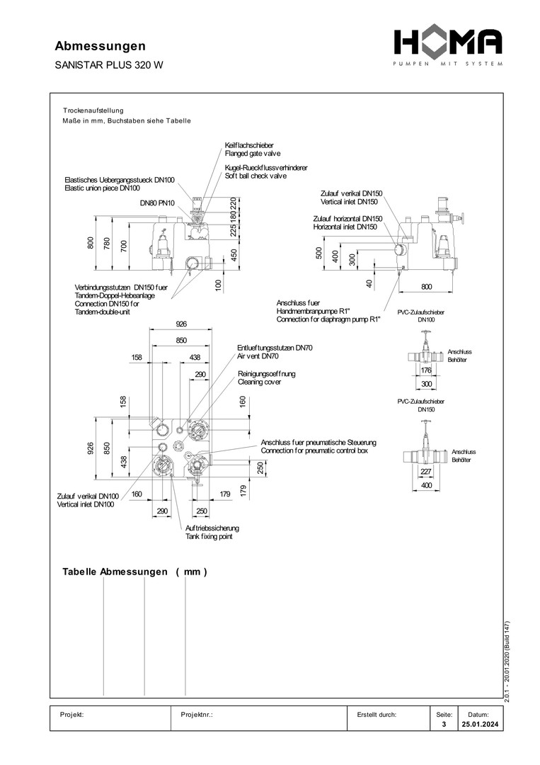 DN 80/DN 100, Zuläufe DN 40/DN 100/DN 150, Freistromrad, freier Durchgang 45 mm Ø , 1450-2900 U/min, Laufrad aus Stahlguss, Laufrad aus Grauguss, Pumpengehäuse und Sammelbehälter aus Kunststoff, Behälter mit 1 Pumpe, Kugel-Rückflussverhinderer, elestisches Übergangsstück, Druckleitung mit Schlauchschellen, pneumatische Niveauschaltung, Standard-Steuergerät, Kabel-Pumpe 4 m, Steuergerät 0,8 m