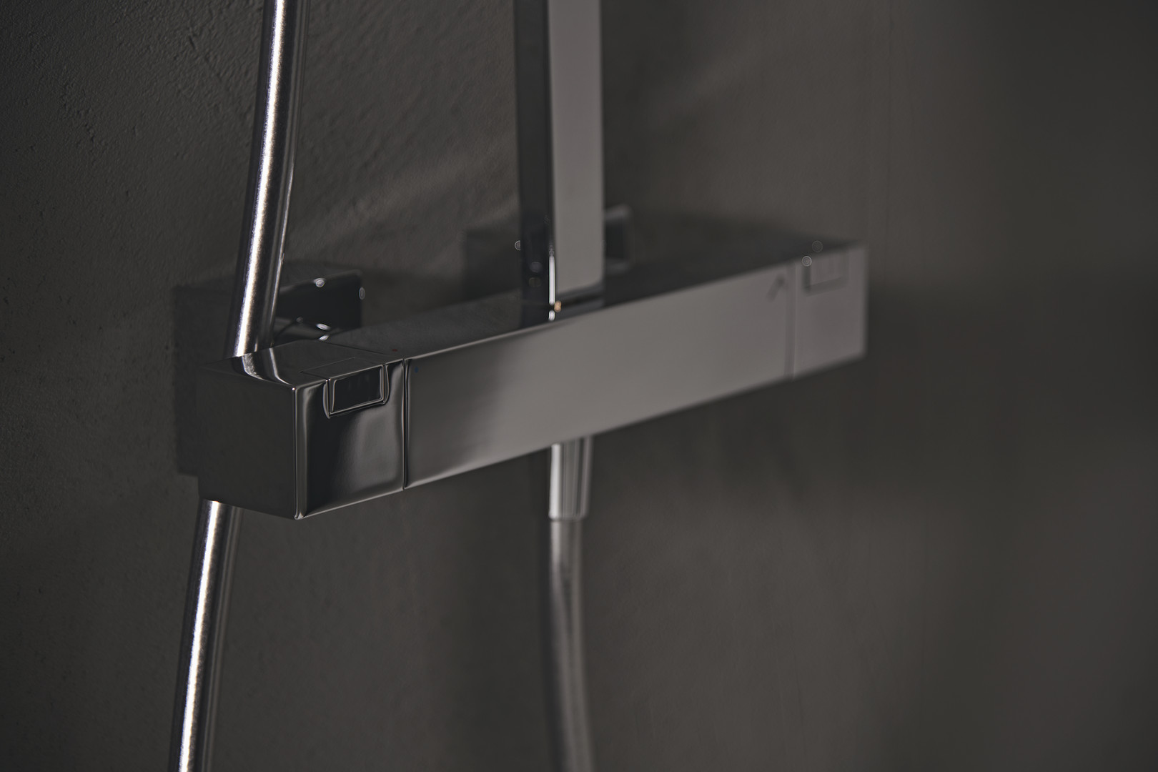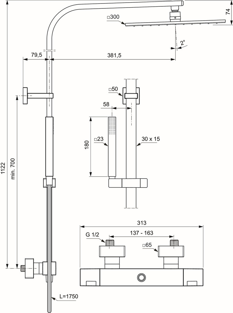 Square, Metall Kopfbrause mit Kugelgelenk, Ø 300 x 300 mm, Idealrain Stick Handbrause mit Antikalkfunktion, rechteckige Wasserführende Brausestange mit schwenkbarem Druckknopfschieber und höhenverstellbarer Wandhalterung, Brauseschlauch „Idealflex“ 1750 mm, Anschluss G 1/2, Rückfl ussverhinderer, DVGW-eigensicher, S-Anschlüsse und Überwurfmuttern verdeckt mit Metallrosetten (verstellbar von 137 – 163 mm), Ausladung 82 mm, Thermostatkartusche mit Wachsdehnstoffelement, Anti-Kalk-Funktion, Heißwassertemperatureinstellung mit Verbrühschutz, RV-Patrone auf der Warmwasserseite mit integriertem Überdruckventil, Wassermengenregulierung mit 2-Wege-Ventil und ECO-Spartaste und keramischen Dichtscheiben, Geräuschverhalten DIN 4109, Gruppe 1, Ausladung gesamt 611 mm, Höhe gesamt 1122 mm