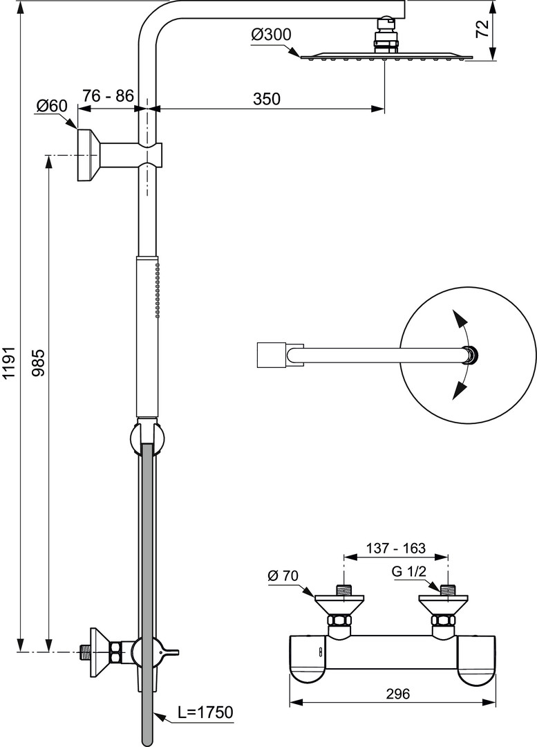 DN 15, Regenbrause, mit Kugelgelenk, EasyClean, Stabhandbrause 1-Funktion, wasserführende Brausestange, mit Wandbefestigung, Brausehalter verstellbar mit Druckknopf, Brauseschlauch 1750 mm, Anschluss G 1/2, Brausethermostat Aufputz DN 15, Cool Body, S-Anschlüsse (verstellbar), Heißwassertemperatureinstellung mit Verbrühschutz, Umschaltung Handbrause/Regenbrause integriert, Lebensdauer DIN EN 1111