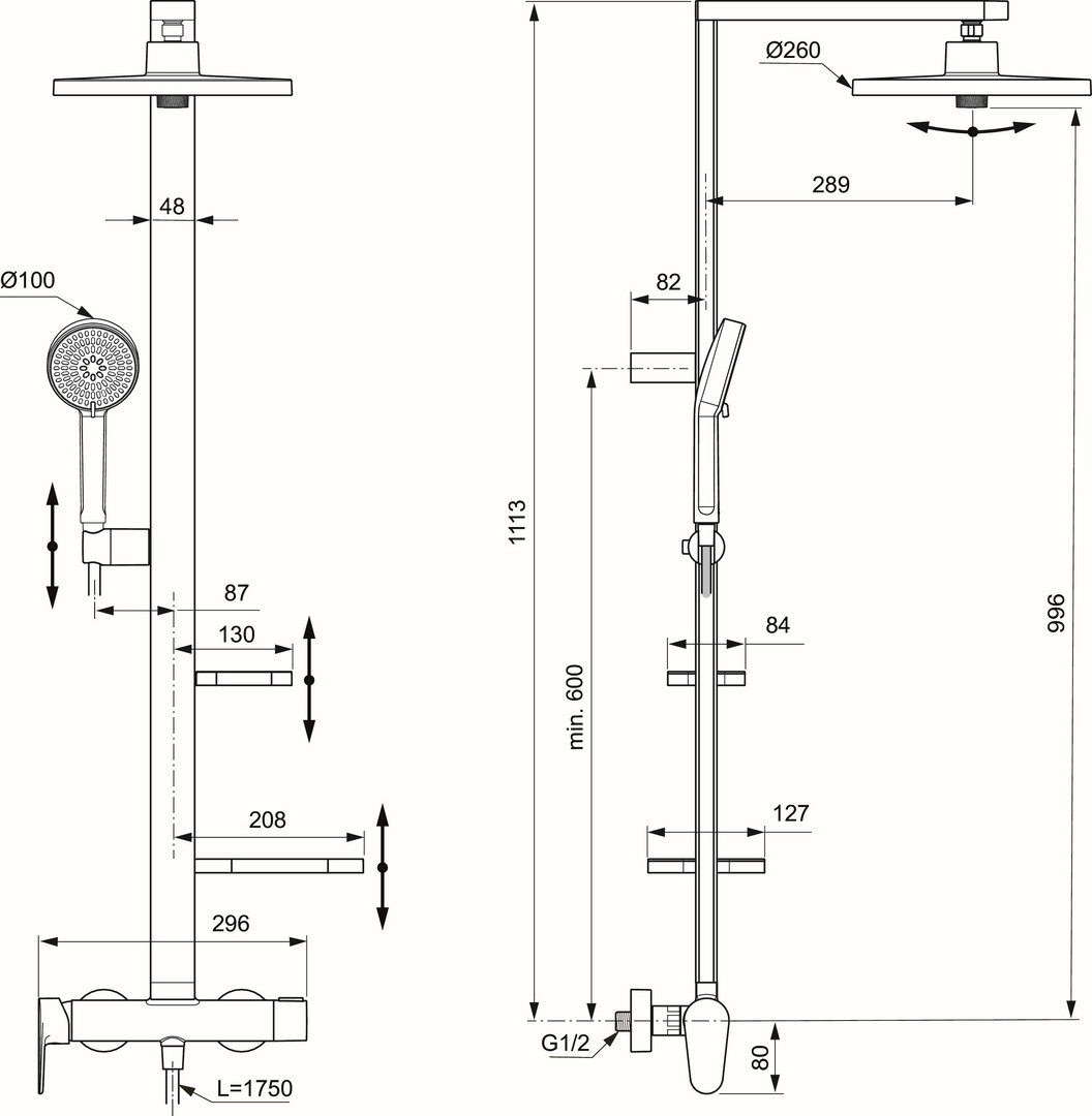 Duschsystem mit Einhebel-Brausearmatur Aufputz DN 15, Regenbrause mit 2-Funktion, Ø 260 mm, Strahlarten: Sanfter Regen und Regen, Drehumschaltung mit Kugelgelenk, EasyClean, Handbrause: 2-Funktion, Ø 100 mm, Strahlarten: Massage und sanfter Regen, Drehumschaltung, EasyClean, Wasserführende Brausestange, mit Wandbefestigung, Brausehalter verstellbar mit Druckknopf, 2 Ablagen (Einsatz herausnehmbar), Brausehalter und Ablagen lassen sich links/rechts individuell montieren, Brauseschlauch Idealflex 1750 mm, Anschluss G 1/2, Einhebel-Brausearmatur Aufputz DN 15, Armaturenkörper aus Aluminium, innenliegende Wasserführung aus Kunststoff, Blei und Nickelfrei, Rückflussverhinderer, Cool Body, S-Anschlüsse (verstellbar), Griffe aus Kunststoff, Ø Kartusche 38 mm, CLICK-Kartusche, FirmaFlow Kartusche mit keramischen Dichtscheiben, Kartusche keramisch, Kartuschenschwenkbereich 100 Grad, Heißwassertemperaturbegrenzer, Heißwassertemperatureinstellung mit Verbrühschutz, RV Patrone auf der Warmwasserseite mit integriertem Überdruckventil (Druckentlastung größer 16 bar), Umschaltung Handbrause/Regenbrause integriert, Geräuschverhalten DIN 4109 Gruppe 1, Lebensdauer DIN EN 817, DIN EN 200, Gewicht 4,447 kg