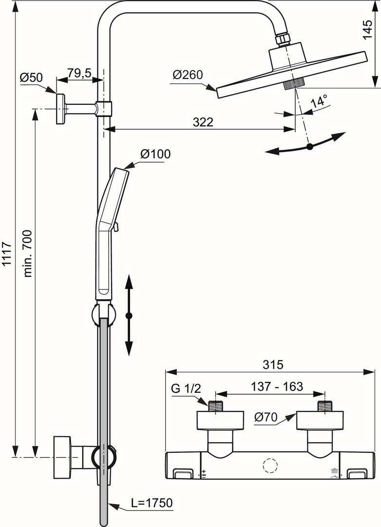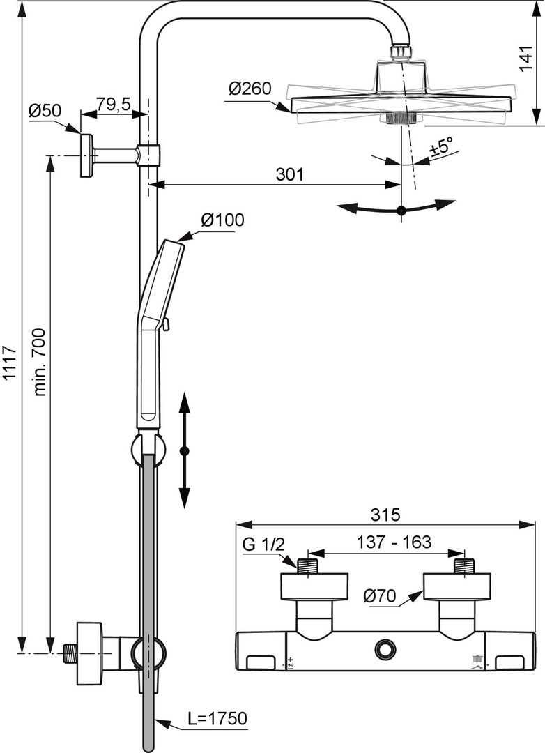 Duschsystem mit Brausethermostat Aufputz DN 15, Regenbrause mit 2-Funktionen, Ø 260 mm | Strahlarten sind sanfter Regen und Regen, mit Drehumschaltung, mit Kugelgelenk, EasyClean, 2-Funktion Handbrause, Ø 100 mm, Strahlarten: Massage und sanfter Regen, Drehumschaltung, EasyClean, wasserführende Brausestange, mit Wandbefestigung, Brausehalter verstellbar mit Drehknopf, Brauseschlauch Idealflex 1750 mm , Anschluss G1/2, Brausethermostat Aufputz DN 15, Rückflussverhinderer, DVGWEigensicher, Cool Body, S-Anschlüsse (verstellbar), Griffe aus Kunststoff | PreciTherm-Thermostatkartusche, Heißwassertemperaturbegrenzer, Heißwassertemperatureinstellung mit Verbrühschutz, RV Patrone auf der Warmwasserseite mit integriertem Überdruckventil (Druckentlastung größer 16 bar), Umschaltung Handbrause/Regenbrause integriert, Geräuschverhalten DIN 4109 Gruppe 1, Lebensdauer DIN EN 200, DIN EN 1111, Gewicht 3,463 kg