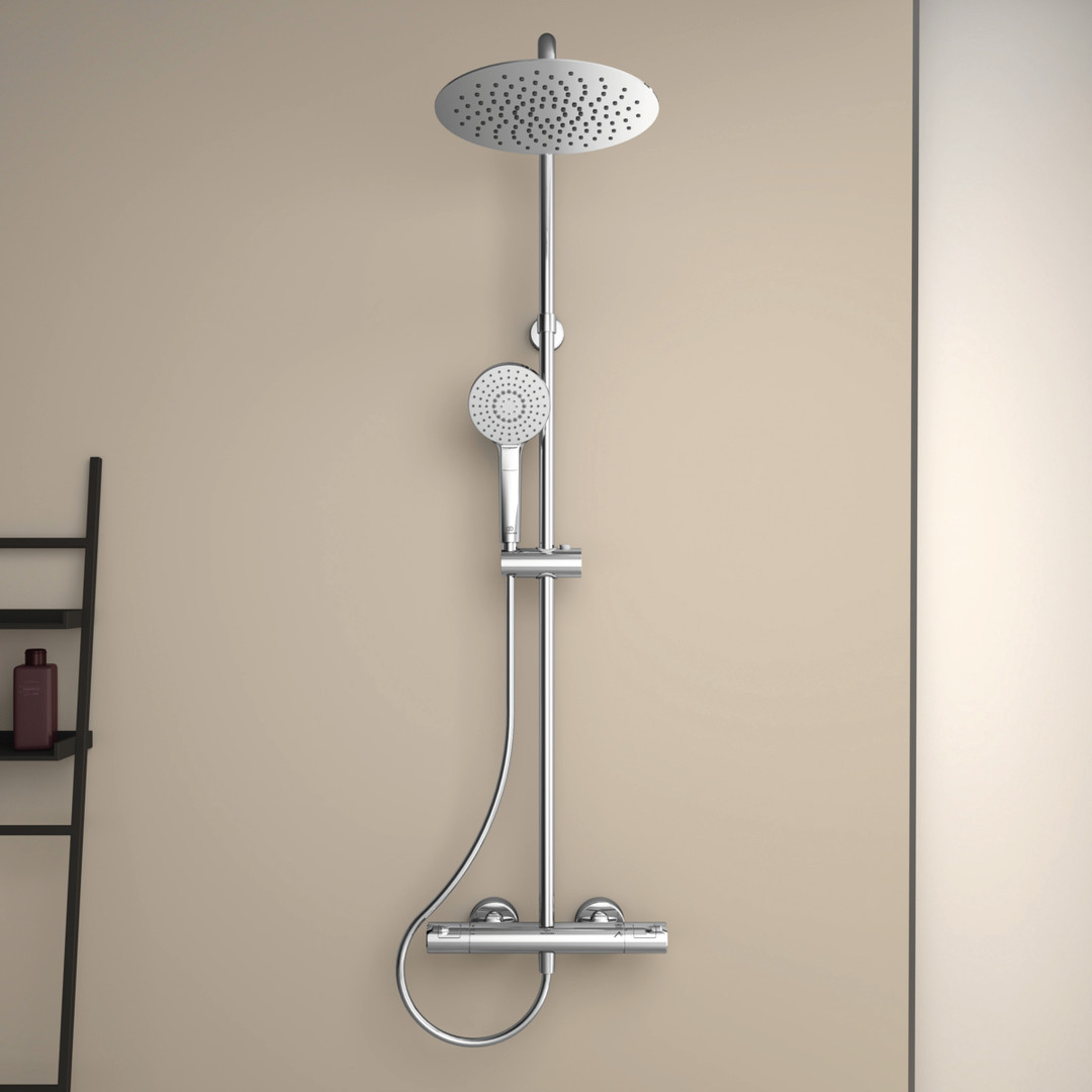 Aufputz DN 15, Regenbrause, Ø 250 mm, mit Kugelgelenk, EasyClean, Evo Handbrause 1-Funktion, Ø 110 mm, EasyClean, wasserführende Brausestange, mit Wandbefestigung, Brausehalter verstellbar mit Druckknopf, Brauseschlauch Idealflex 1750 mm, Anschluss G1/2, Brausethermostat Aufputz DN 15, Rückflussverhinderer, DVGW-Eigensicher, Cool Body, S-Anschlüsse (verstellbar), Griffe aus Kunststoff, Thermostatkartusche mit Wachsdehnstoffelement, Heißwassertemperaturbegrenzer, Heißwassertemperatureinstellung mit Verbrühschutz, RV Patrone auf der Warmwasserseite mit integriertem Überdruckventil (Druckentlastung größer 16 bar), Umschaltung Handbrause/Regenbrause integriert, Geräuschverhalten Gruppe 1
