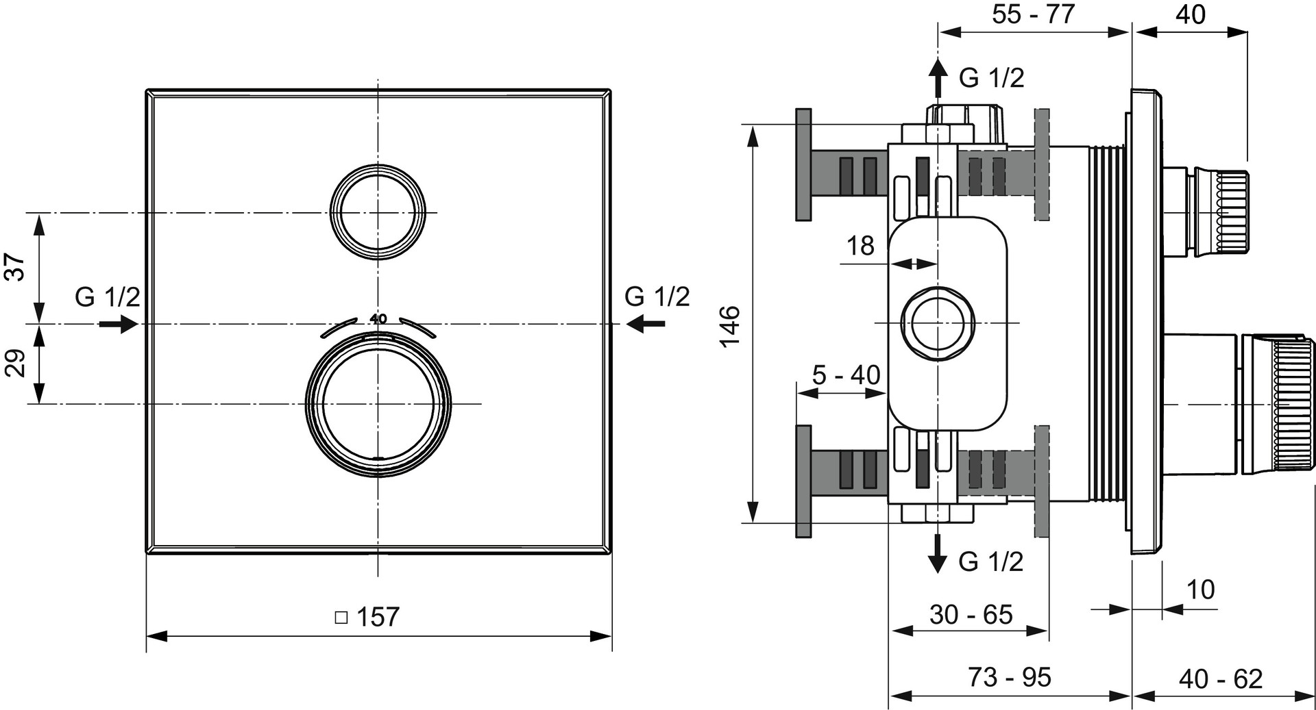 Bausatz 2 für Fertigmontage, eine Entnahmestelle, Rückflussverhinderer, Unterputz-Bausatz 1 zur Montage benötigt (A1000NU - separat erhältlich), Griffe aus Metall, Öffnen/Schließen per Knopfdruck, Volumenkontrolle durch Drehen, Rosette 157x157 mm, Thermostatkartusche mit Wachsdehnstoffelement, Heißwassertemperaturbegrenzer, Temperatursperre 40 °C, DICHT-FIX System separate Abdichtung jeder Öffnung für optimalen Schutz des Bauwerks gegen Feuchtigkeit und Wasser, Geräuschverhalten DIN 4109 Gruppe 1, Lebensdauer DIN EN 1111, für eine Verwendung als Badearmatur ist eine separater Rohrtrenner erforderlich