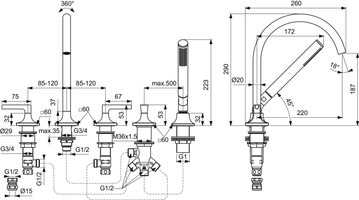 DN 15, Luftsprudler, Caché (innenliegend), Griffe aus Metall, Schaftverschraubung von unten, Oberteil mit keramischen Dichtscheiben, mit 5 Rosetten (eckig) aus Metall, Schwenkbereich Auslauf 360°, Anschlussmaß Brauseschlauch 1/2 Zoll, mit Zugumsteller Wanne/Brause, Durchfluss Handbrause (bei 3 bar) 8 l/min, Geräuschverhalten DIN 4109 Gruppe 1, Lebensdauer DIN EN 817, DIN EN 200