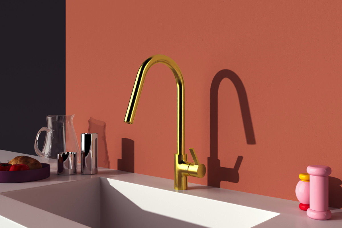 Ideal-Standard Küchenarmatur Gusto brushed gold, mit hohem Rohrauslauf und herausziehbarer Handbrause
