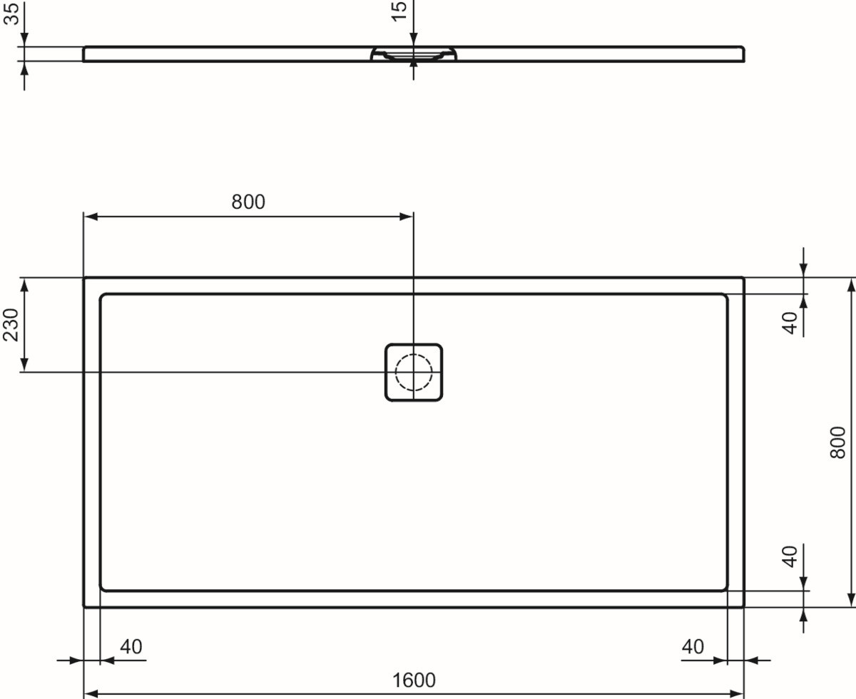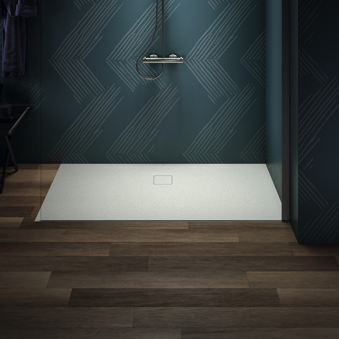 Sanitär-Acryl mit Polymer-Mineralgusskern, mit Ablaufabdeckung aus lackiertem Edelstahl, bodenebener Einbau möglich, geeignet zur Montage direkt auf den Estrichaufbau, Antirutsch-Oberfläche nach DIN EN 51097/Klasse C, plangeschliffener Unterbau, Position Ablaufloch Mitte Längs/Querseite, Norm DIN EN 14527, DIN EN 251, DIN EN 51097 Klasse C