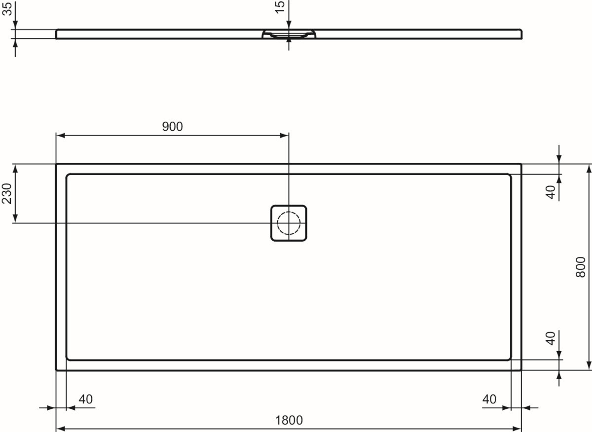 Sanitär-Acryl mit Polymer-Mineralgusskern, mit Ablaufabdeckung aus lackiertem Edelstahl, bodenebener Einbau möglich, geeignet zur Montage direkt auf den Estrichaufbau, Antirutsch-Oberfläche nach DIN EN 51097/Klasse C, plangeschliffener Unterbau, Position Ablaufloch Mitte Längs/Querseite, Norm DIN EN 14527, DIN EN 251, DIN EN 51097 Klasse C
