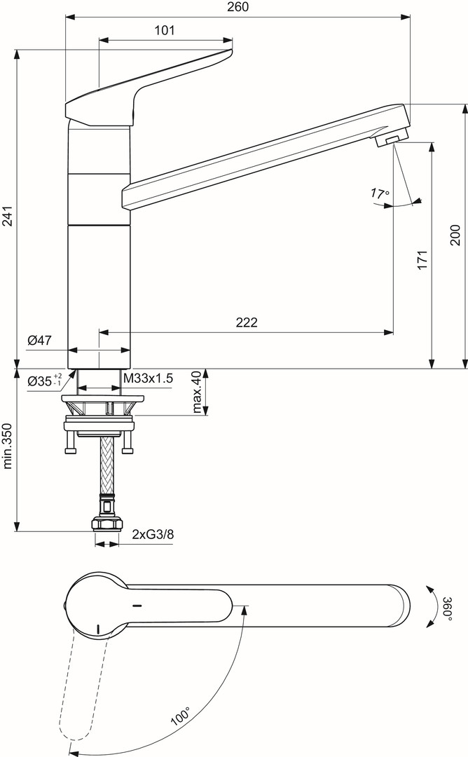 DN 15, Luftsprudler (sichtbar), Ausladung 222 mm, Auslaufhöhe 171 mm, Griff aus Metall mit Rot-/Blau-Markierung, Schwenkbereich Auslauf 360°, Schnellmontagesystem, 35 mm erforderlicher Hahnlochdurchmesser, Kartusche Ø 38 mm, CLICK-Kartusche mit keramischen Dichtscheiben, Kartuschenschwenkbereich 100°, Kartuschenübersetzung aus Edelstahl, Heißwassertemperaturbegrenzer, Norm DIN EN 248, Lebensdauer DIN EN 817, DIN EN 200, Geräuschverhalten DIN 4109 Gruppe 1