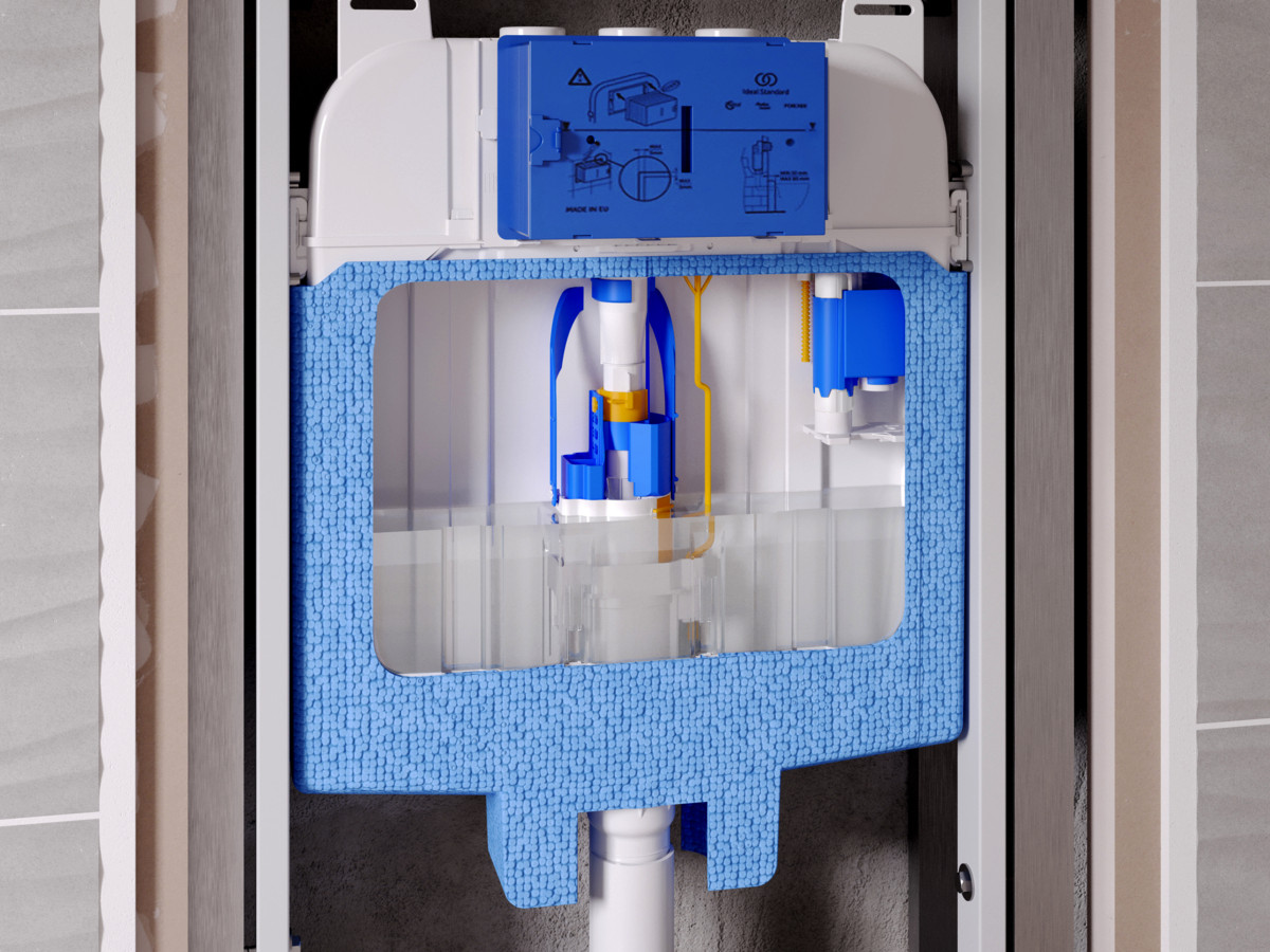 mit Unterputz-Spülkasten für Leichtbauwände, einbaufertig vormontiertes WC-Element für Ständer- oder Vorwandmontage (Trockenbau), selbsttragender Profil-Stahlrahmen mit höhenverstellbaren Füßen, Oberfläche korrosionsgeschützt durch Kunststoff-Pulverbeschichtung, Rahmen bis 400 kg belastbar, mit vormontiertem Unterputz-Spülkasten, schwitzwassergedämmt, wassersparend durch Zweimengen-Spülung, umstellbar auf 4/2, 6/3 oder 7/3 l Spülmenge, wassersparend optimierter Füllvorgang durch SmartValve-Technik Instandhaltungs- und Montagearbeiten am Spülkasten werkzeuglos, für wandhängende WC mit 180 oder 230 mm Befestigungsmaß, Kombination mit mechanischen, pneumatischen oder elektronischen Betätigungsplatten, kombinierbar mit Hygienesysteme SmartFlush
