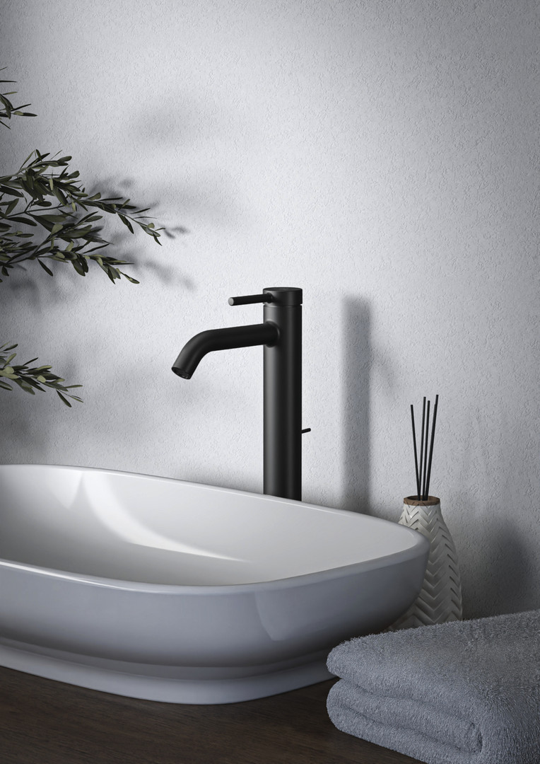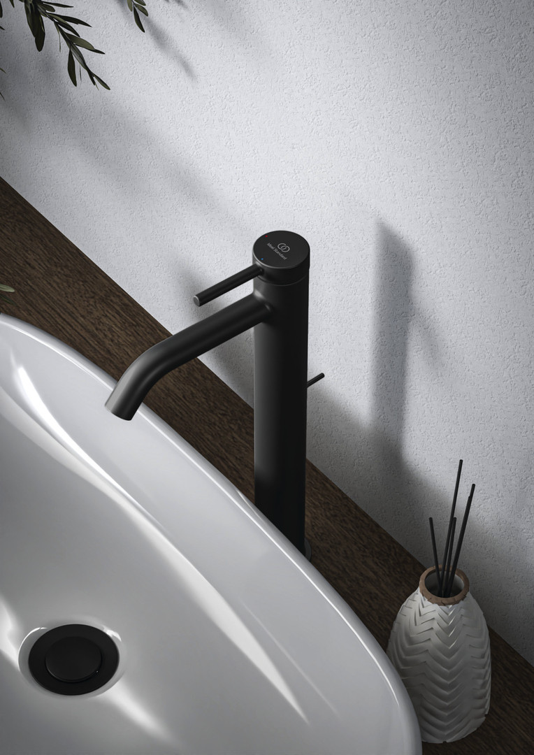 Ideal-Standard Waschtisch-Einhebelmischer Ceraline Nuovo H240 verlängerter Sockel, Ausladung 135mm, BlueStart, mit Metall-Ablaufgarnitur, silk black