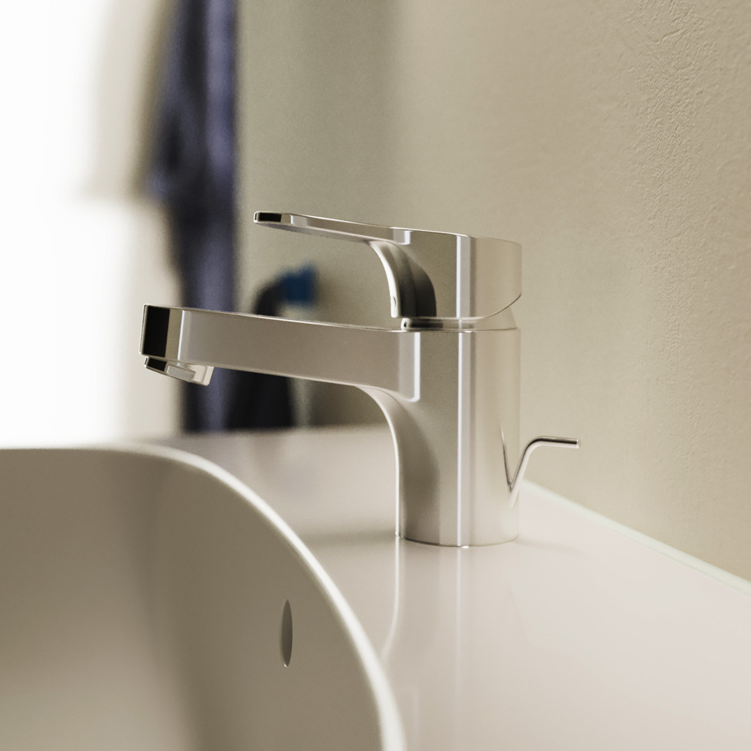 Waschtischarmatur in chrom, 3.8 l/min (3 bar), mit Ablaufgarnitur - mit Strahlregler, Click-Technologie, FirmaFlow, SmartShine Oberfläche, Höhe 122 mm, Breite 47 mm, Länge 152 mm, Befestigungsart EasyFix, Durchflussleistung 3.8 Liter in der Minute, Hahnloch-Befestigung, Form abgerundet / geschwungen