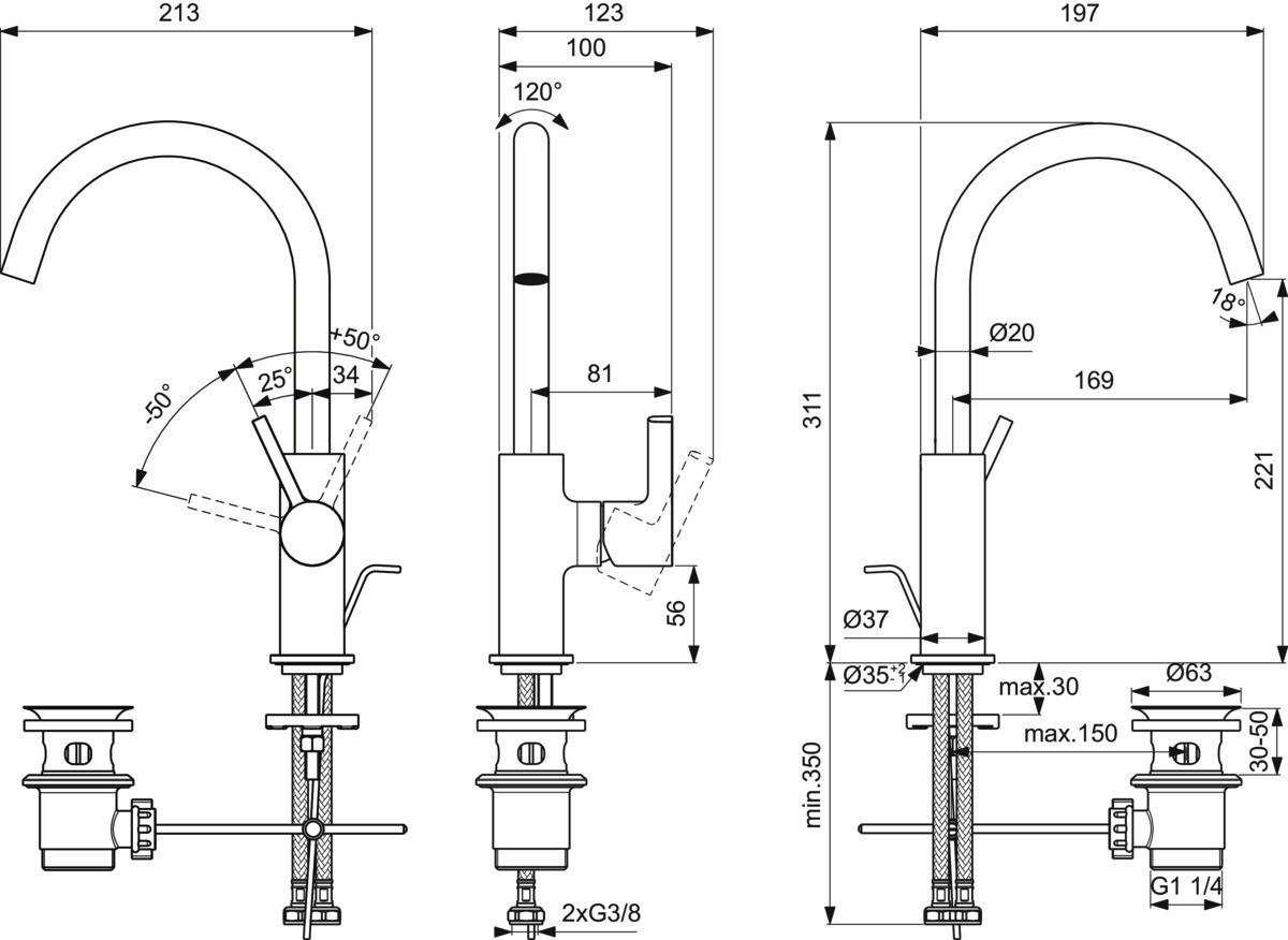 DN 15, Auslaufhöhe 221 mm, Luftsprudler, Caché (innenliegend), Metall-Zugstangen-Ablaufgarnitur G 1 1/4, flexible Anschlussschläuche G 3/8, Griff aus Metall, Schnellmontagesystem, Kartusche Ø 28 mm, Kartusche mit keramischen Dichtscheiben, Kartuschenschwenkbereich 100°, Kartuschenübersetzung aus Kunststoff, Heißwassertemperaturbegrenzer beiliegend, Schwenkbereich Auslauf 120°, Norm DIN EN 248, Geräuschverhalten DIN 4109 Gruppe 1, Lebensdauer DIN EN 817, DIN EN 200, Gewicht: 1,626 kg