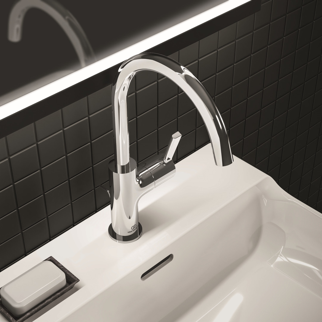 Ideal-Standard Waschtisch-Einhebelmischer Joy Ausladung 169mm, hoher Auslauf, schwenkbar, mit Metall-Ablaufgarnitur, verchromt