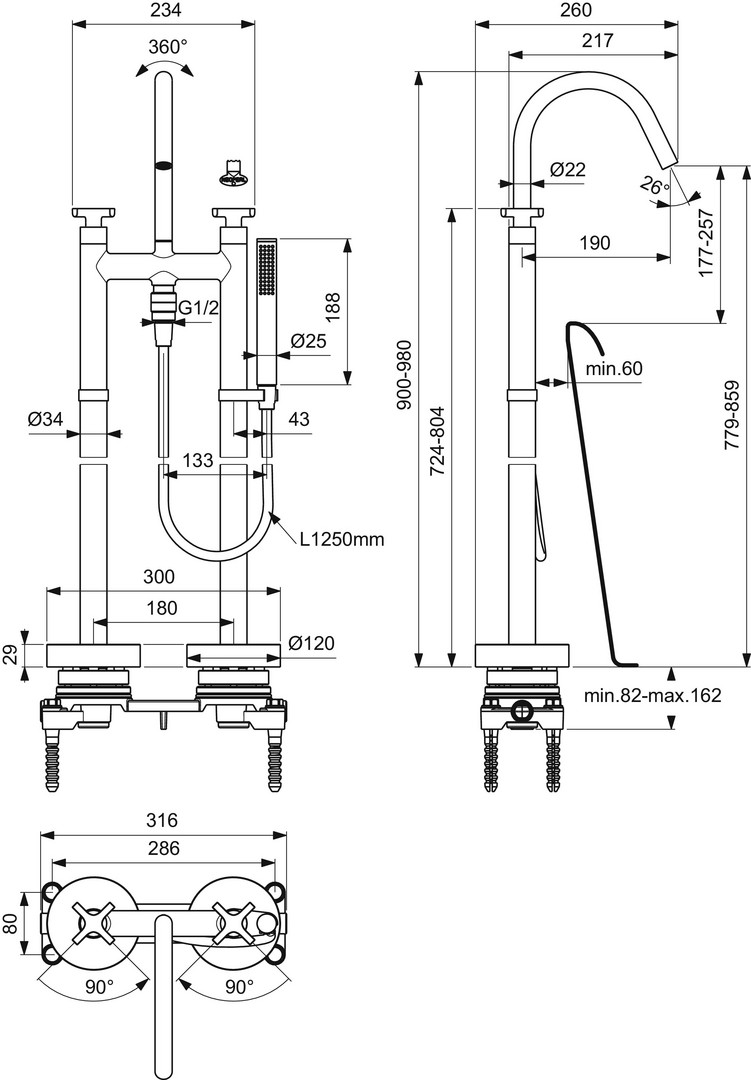 Ideal-Standard Zweigriff-Wannenarmatur Joy Neo freistehend, mit Handbrause-Set, Kreuzgriffe, Ausladung 190mm, magnetic grey