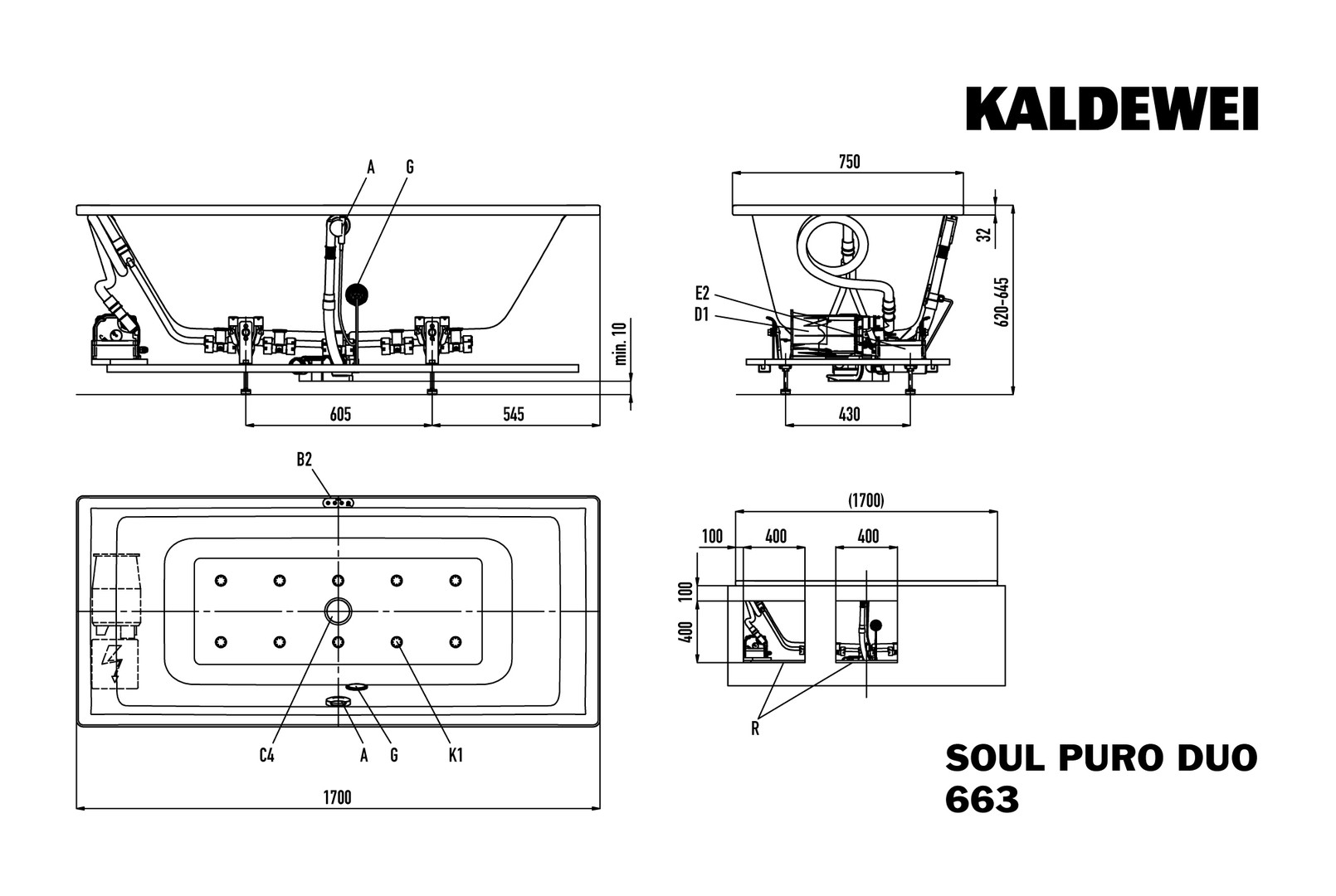 KALDEWEI PURO DUO, Mod.663 SOUL 1700x750mm, alpinweiß, rechts, integrierter Einlauf, Sichtteile chrom
