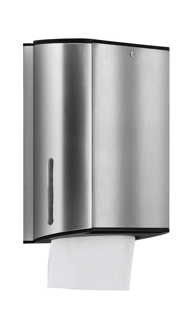 Betätigung von unten, Befüllung durch abschließbare Fronttür, Sichtschlitz für Füllstandsanzeige, für gefalzte Papiertücher (zz-Falz, c-Falz, Interfold), geeignet (Länge 240-254/Breite 100-120 mm), verdeckte Befestigung, zum Schrauben, mit Befestigungs-Set