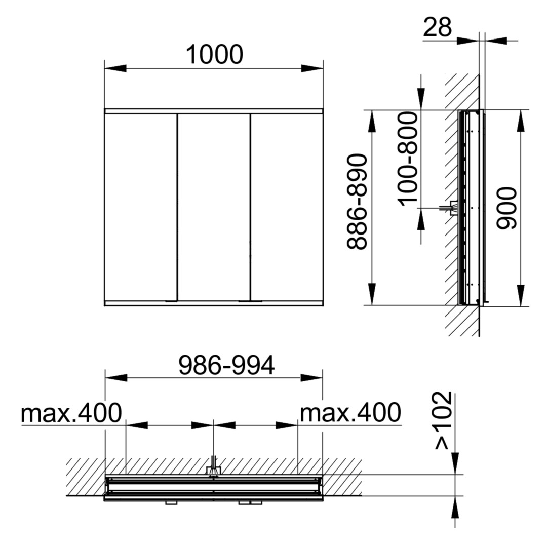 KEUCO Spiegelschrank Royal Modular 2.0 100 x 90 x 12 cm, ohne Steckdose, UP, 3-türig 800300101000000