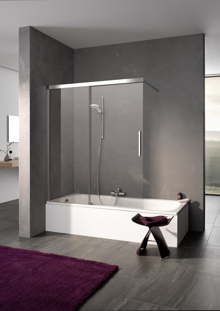 zum Einbau auf Badewanne, teilgerahmte Tür mit einem Gleittürsegment, nach einer Seite öffnend, mit einem Festfeld, mit Wandstutze, Verglasung mit 6 mm Einscheiben-Sicherheitsglas nach EN 12150, optional mit Pflegeleicht-Beschichtung, Profile aus eloxiertem Aluminium, Griffe aus Metall, Verstellmöglichkeit im Wandprofil 25 mm, Gleittürsegment mit Soft-Open- und Soft-Close-Funktion, zur Reinigung nach innen schwenkbar, kugelgelagerte Laufrollen, durchgehende Dichtprofile, waagerechte Dichtleiste mit Wasserabpralleffekt, mit Befestigungsmaterial, geprüft nach DIN EN 14428, Schräge unter dem Festfeld max. 2 mm, Gesamtschräge max. 3 mm, Wandstütze 1200 mm, kürzen der wandstütze bauseits möglich