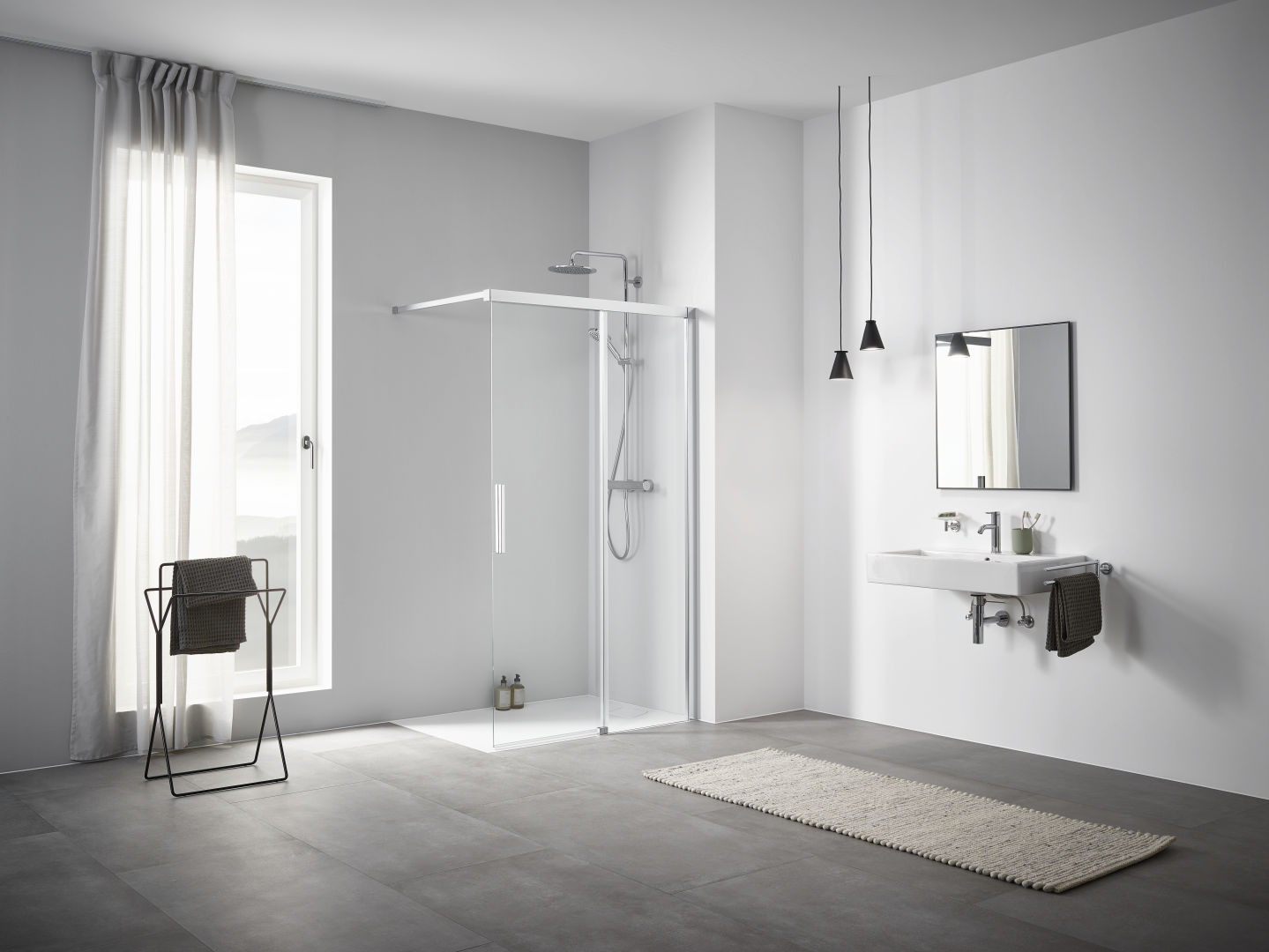 teilgerahmte Walk-In mit einem Gleittürsegment, nach einer Seite öffnend, mit einem Festfeld, mit Wandstütze, Verglasung mit 6 mm Einscheiben-Sicherheitsglas nach EN 12150, optional mit Pflegeleicht-Beschichtung, Profile aus eloxiertem Aluminium, Griffe aus Metall, Verstellmöglichkeit im Wandprofil 25 mm, Gleittürsegment mit Soft-Open- und Soft-Close-Funktion, zur Reinigung nach innen schwenkbar, kugelgelagerte Laufrollen, durchgehende Dichtprofile, waagerechte Dichtleiste mit Wasserabpralleffekt, mit Befestigungsmaterial, geprüft nach DIN EN 14428, Schräge unter dem Festfeld max. 2 mm, Gesamtschräge max. 3 mm, Länge Wandstütze 1200 mm, kürzen der Wandstütze bauseits möglich