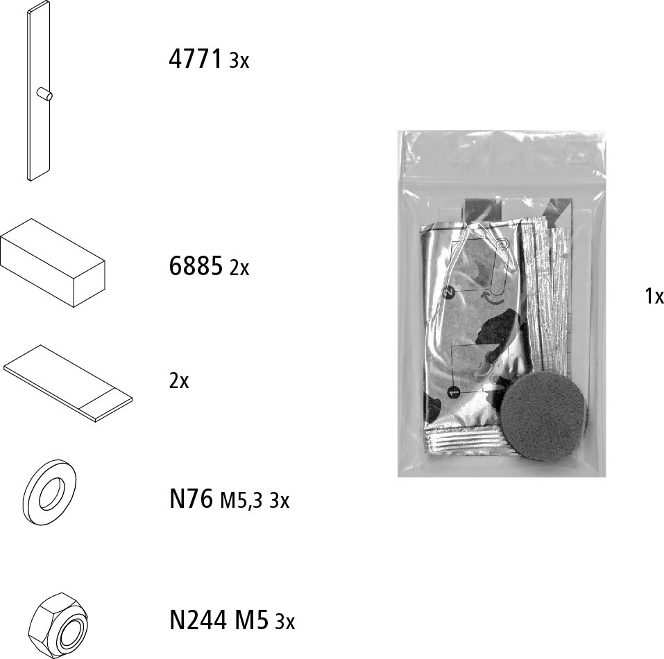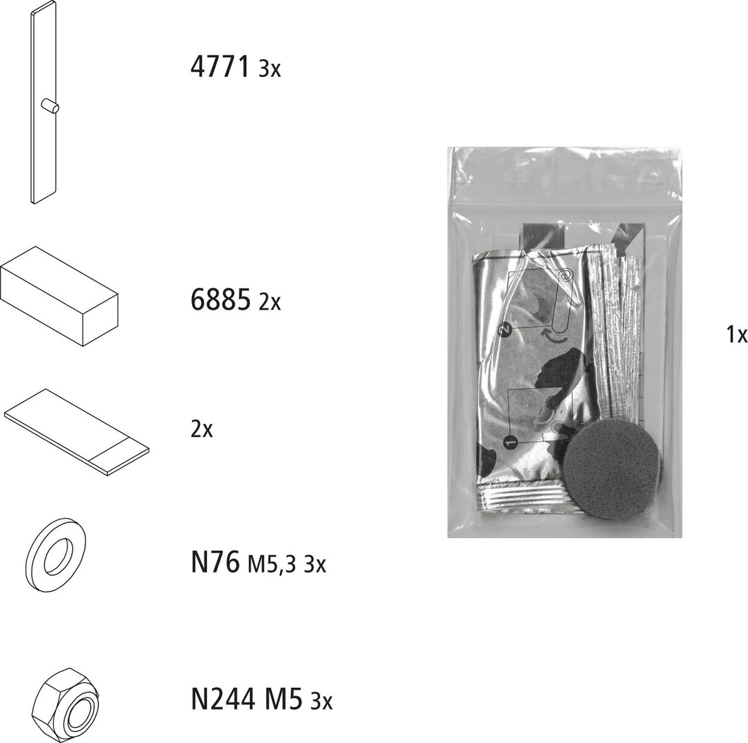 für erneute Montage nach erfolgter Demontage, bestehend aus 3 Montageplatten, Klebstoff und Montagekleinteilen