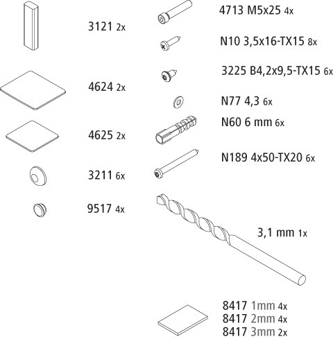 bestehend aus Schrauben, Dübeln und diversen Abdeckungen