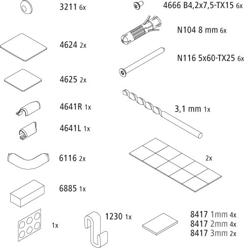 bestehend aus Schrauben, Dübeln und diversen Abdeckungen