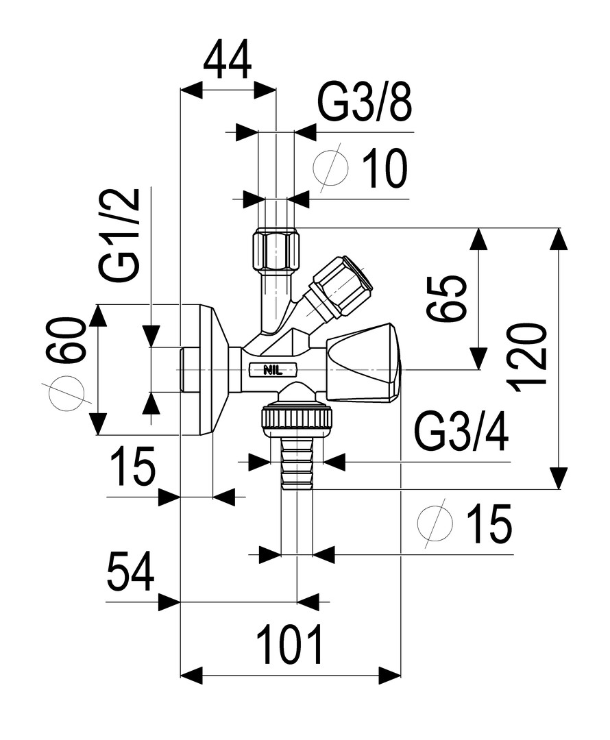 Kombi - Eckventil 1/2", ELB - Quetschverschraubung 3/8", Schlauchverschraubung 3/4".