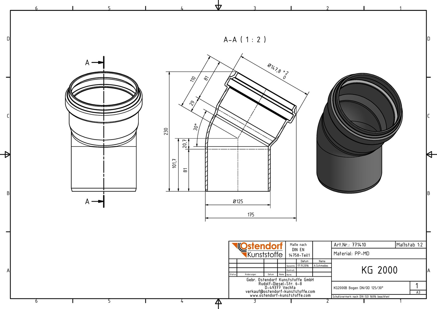 Ostendorf KG2000 Bogen B DN/OD 125, 30Grad