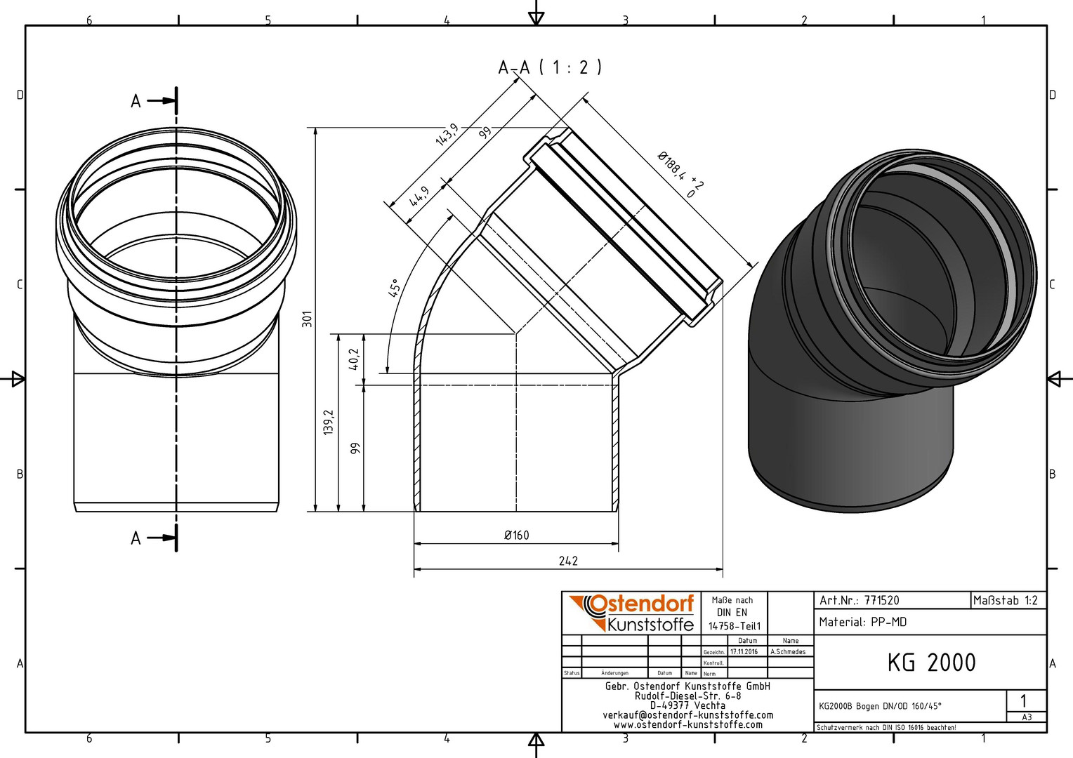 Ostendorf KG2000 Bogen B DN/OD 160, 45Grad