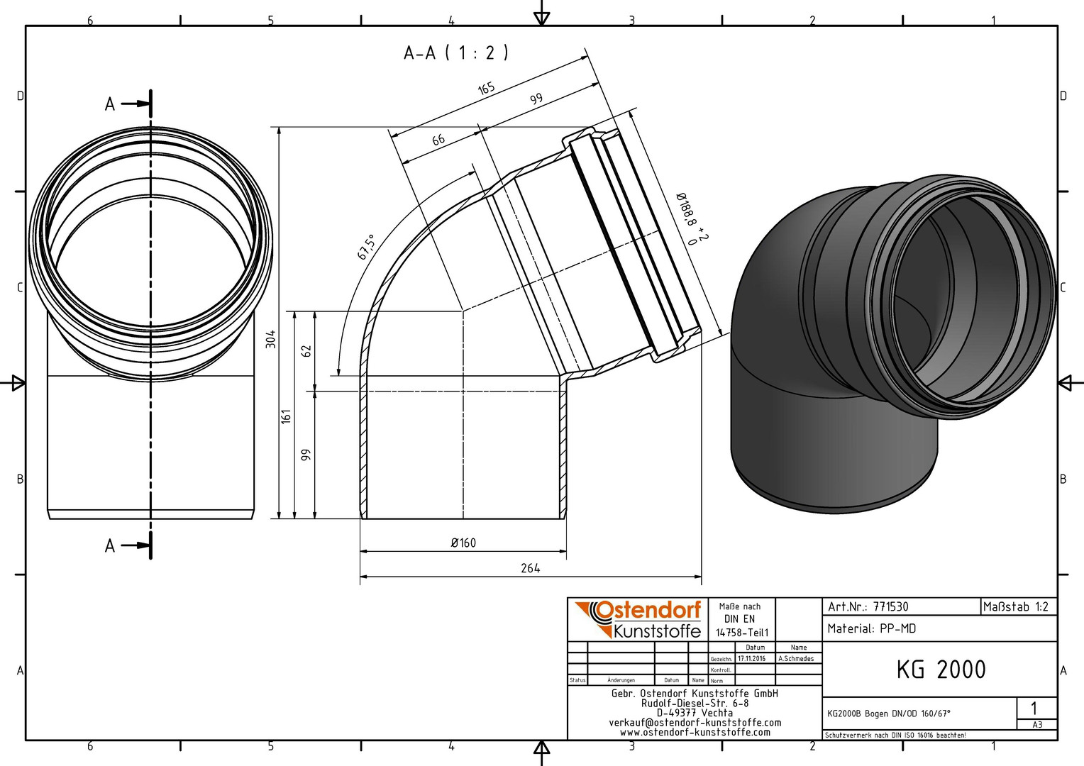 Ostendorf KG2000 Bogen B DN/OD 160, 67,5Grad
