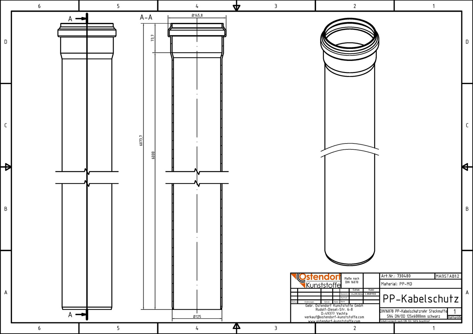 Ostendorf Kabelschutzrohr PP DN/OD 125, 6000mm, schwarz, mit Steckmuffe OS730480