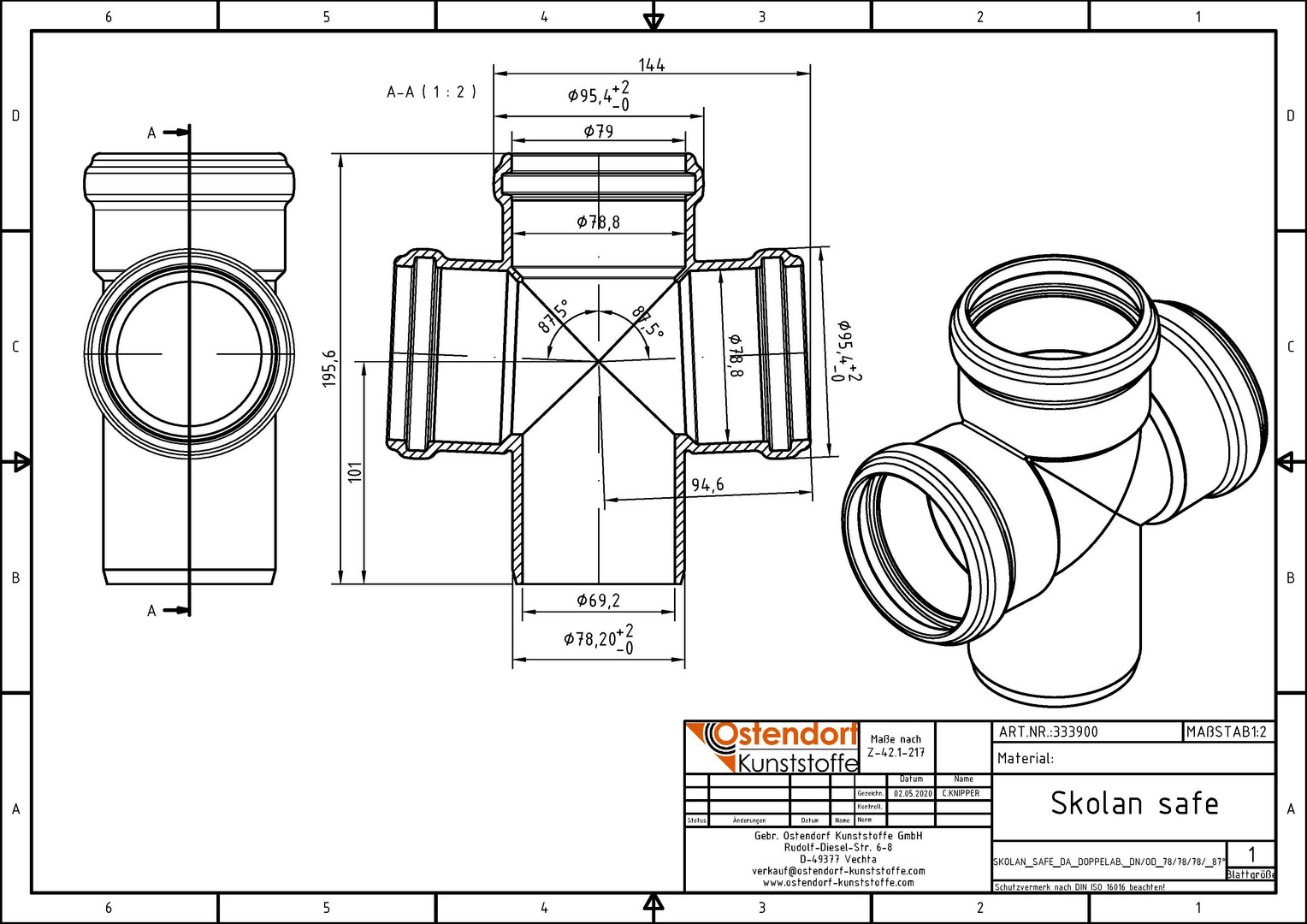 Ostendorf SKOLANsafe Doppelabzweig DA DN/OD 78/78/78/78 x 87,5° OS333900