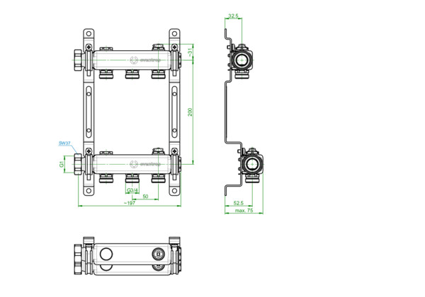 Anschlussgewinde Vor- und Rücklauf G 1 IG, Anschlussgewinde Heizkreise G 3/4 AG, Gehäusewerkstoff Edelstahl, Heizkreise nicht absperrbar, max. Betriebsdruck 10 bar, mit Wandhalterung