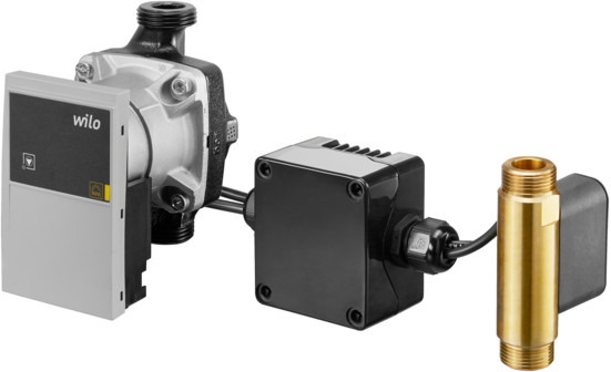 bestehend aus Elektronikbox mit Signal, Netzkabeln und Strömungsschalter, Hocheffizienzpumpe Wilo-Yonos PARA ST 15/7 130 PWM2 für den Primärkreis (Pufferspeicherkreis)