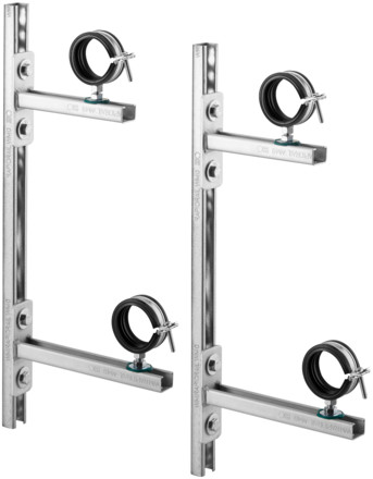höhen- und tiefenverstellbar, Konsolen mit jeweils 2 Rohrschellen mit Schallschutzeinlagen, Schnellverschluss und Wandbefestigung