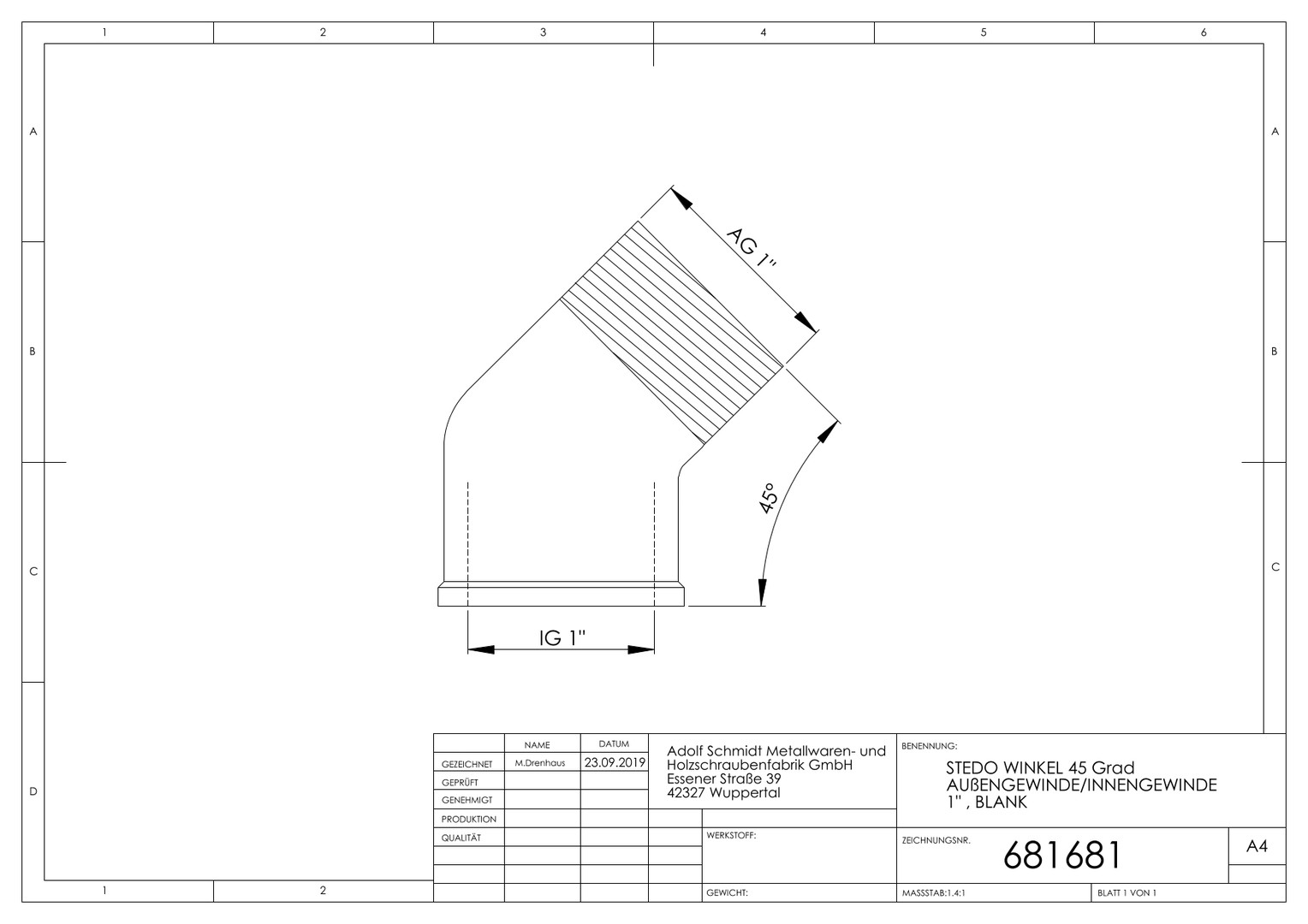 STEDO Winkel 1", 45Grad, IGxAG, Messing CW617N roh