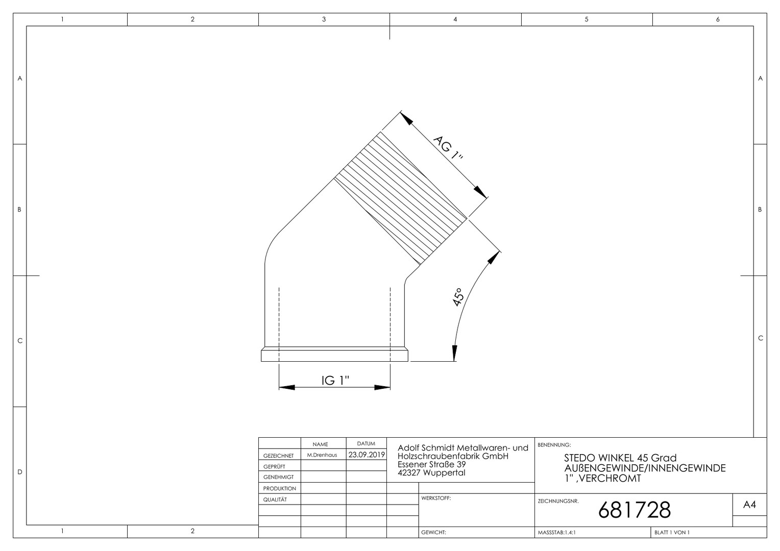 STEDO Winkel 1", 45Grad, IGxAG, Messing CW617N verchromt ASW681728