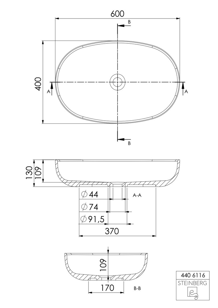 Serie 440 Aufsatzwaschtisch oval aus Solid Surface ohne Hahnloch,matt white, Schaftventil separat bestellen
