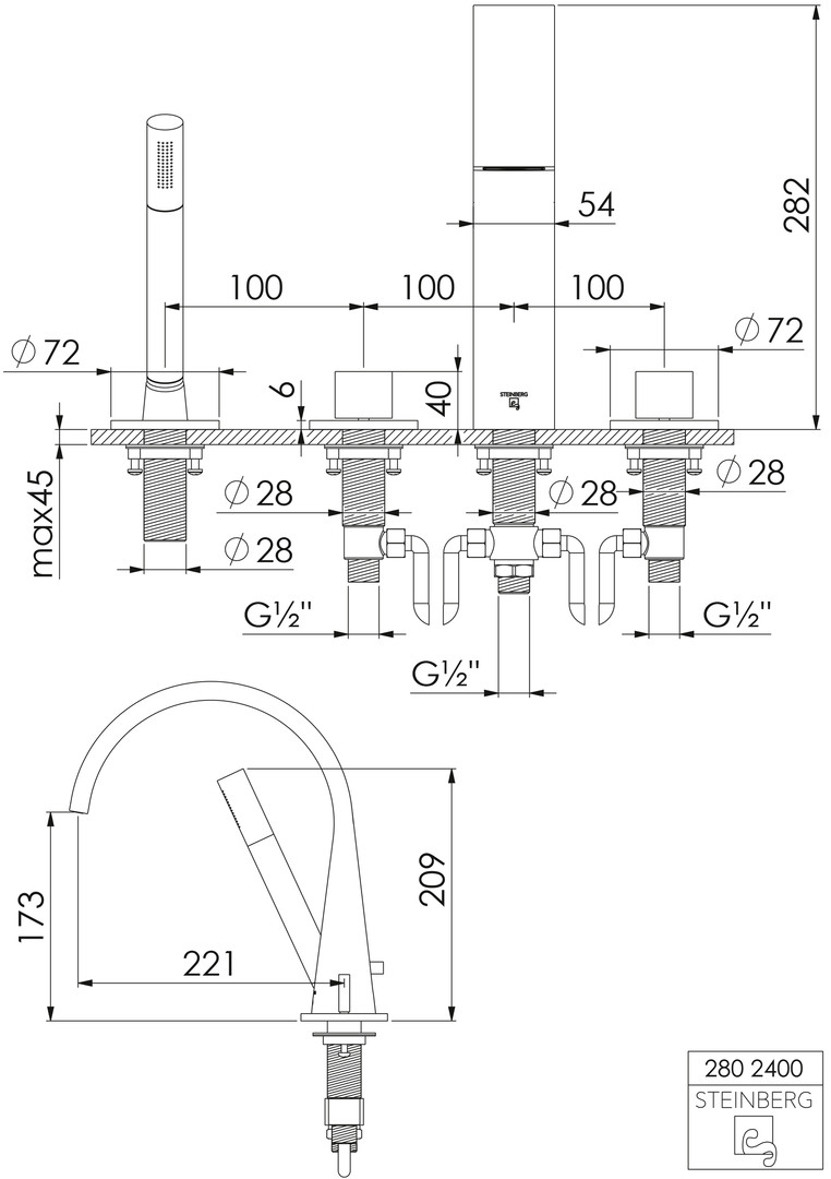 Steinberg 4-Loch-Wannenrand-Armatur Serie 280 Ausladung 221 mm, mit 90Grad Keramikventilen, chrom