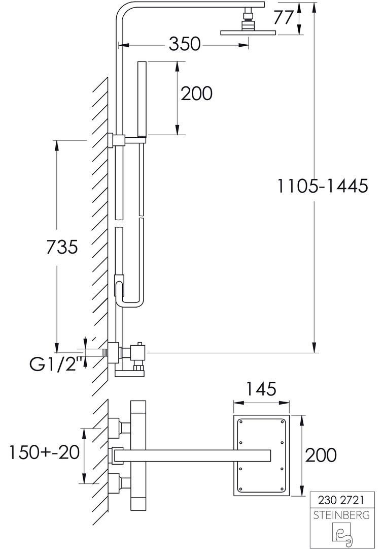 Steinberg Brauseset Serie 230 mit AP-Thermostatarmatur, Regen-/Handbrause, chrom