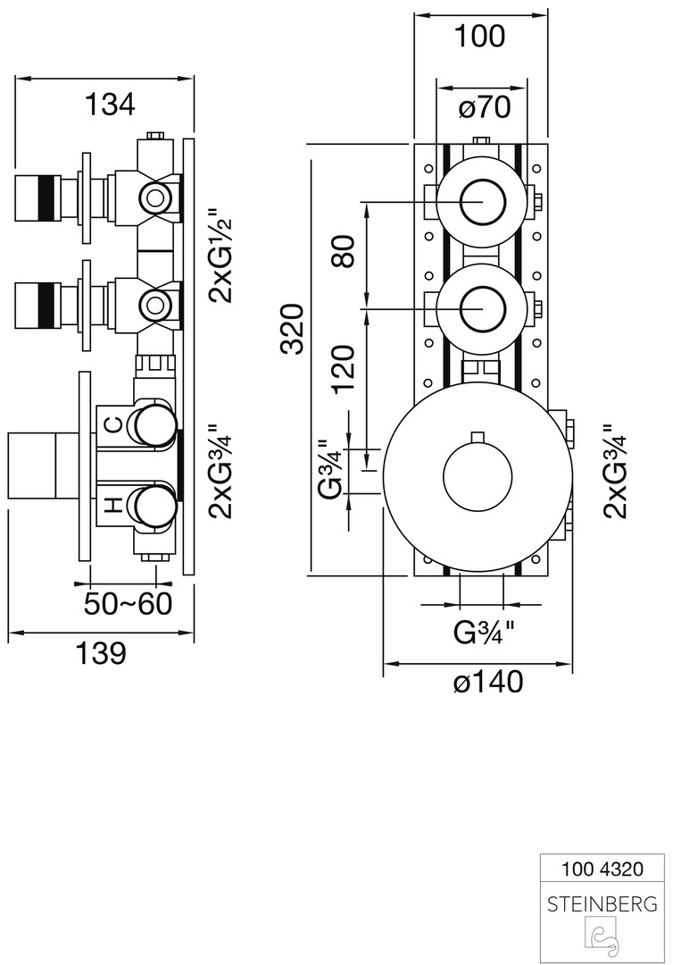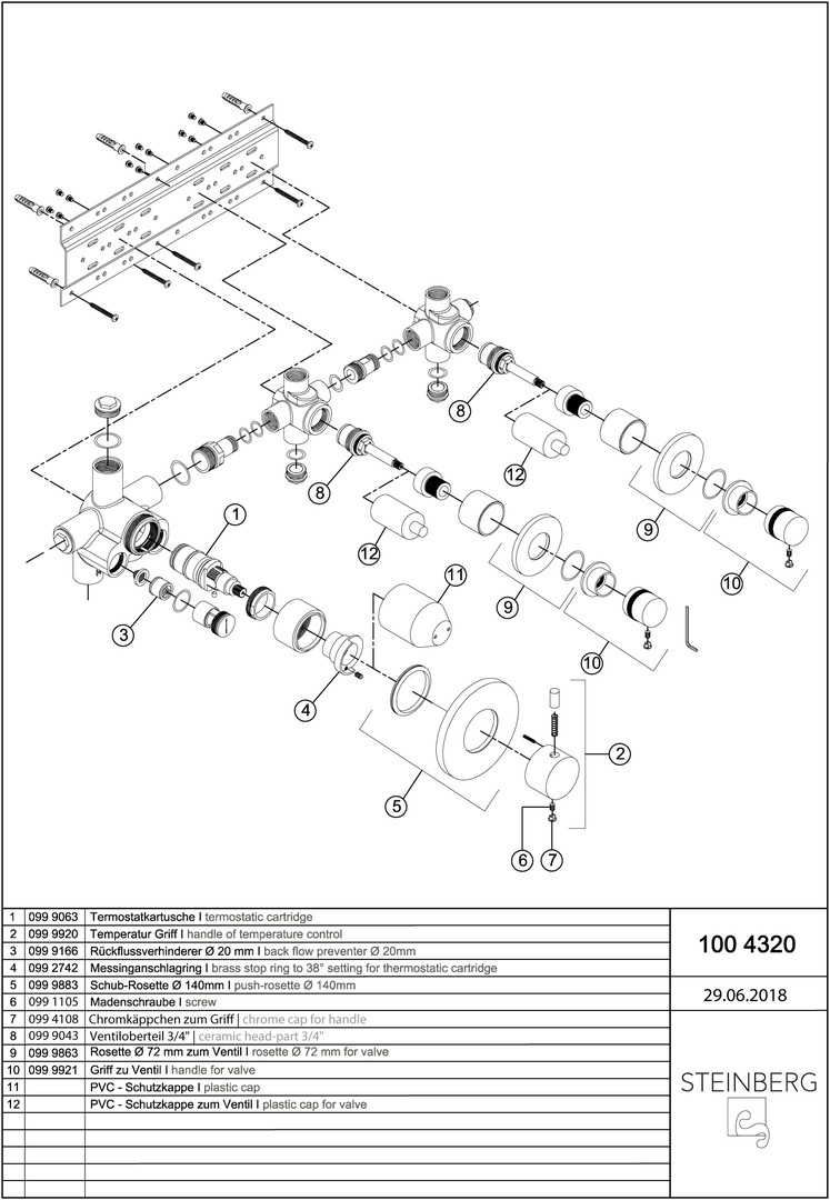 Steinberg Fertigmontageset Serie 100 UP-Thermostat 3/4", 2 Unterputzventile 1/2", chrom