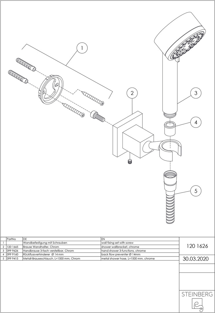 Steinberg Handbrausegarnitur Serie 120 mit Wandhalter und Brauseschlauch 1500mm, chrom