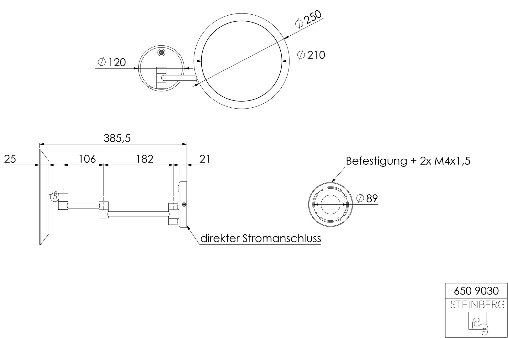 Steinberg LED-Kosmetikspiegel Serie 650 d= 250mm, 2-armig, 5-fach Vergrößerung, chrom