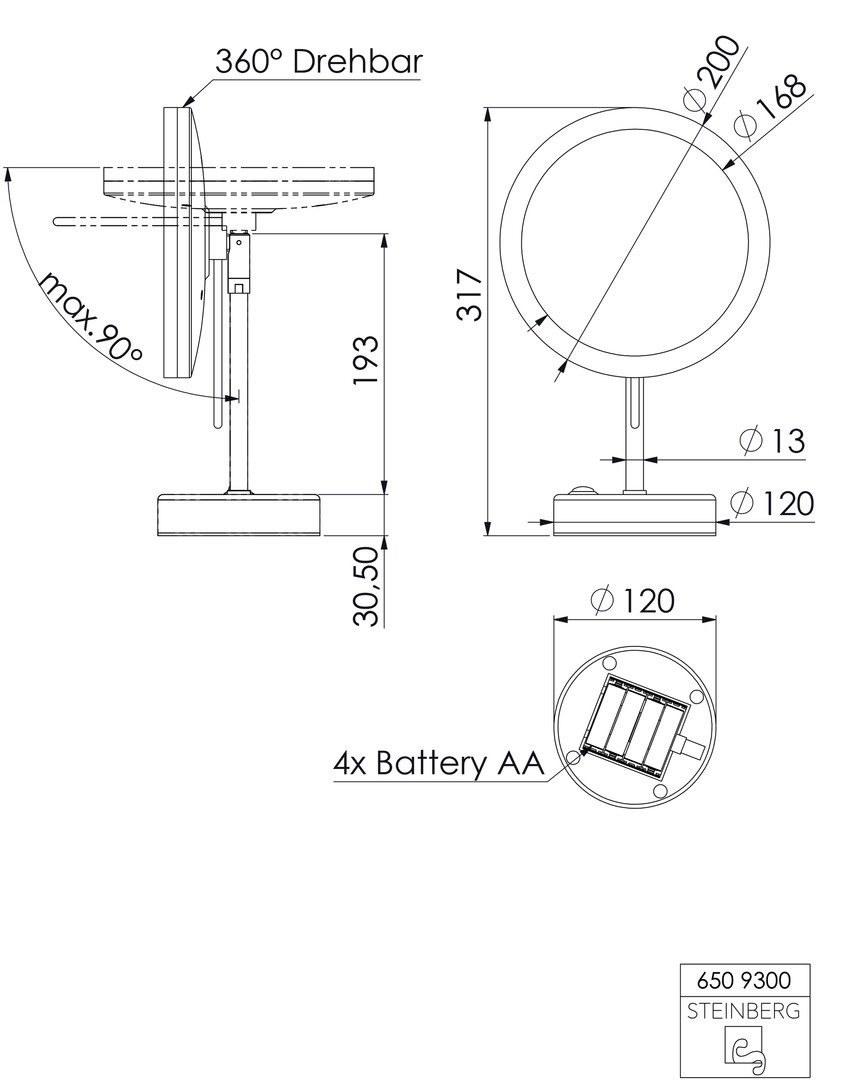 Steinberg LED-Standkosmetikspiegel Serie 650 d= 200mm, 2-armig, 5-fach Vergrößerung, chrom