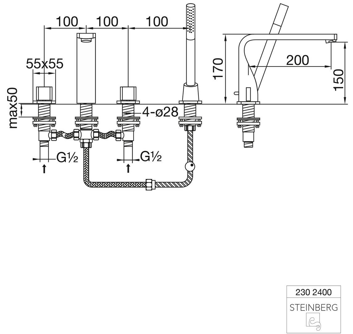 Steinberg Wannen-4-Loch-Armatur Serie 230 Ausladung 200 mm, ausziehbare Handbrause, chrom