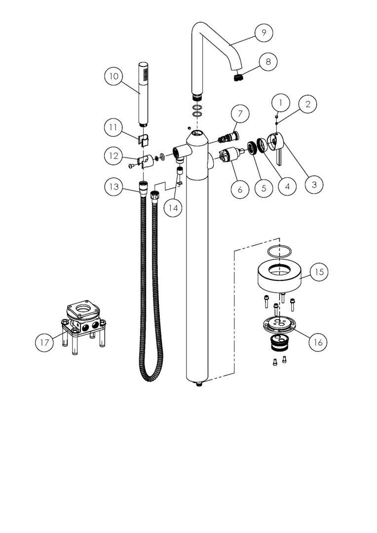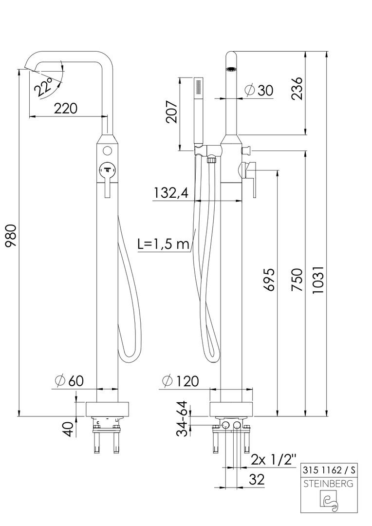Steinberg Wannenarmatur Iconic 315 freistehend, 220mm, mit Keramikventil 90Grad, chrome ST3151162