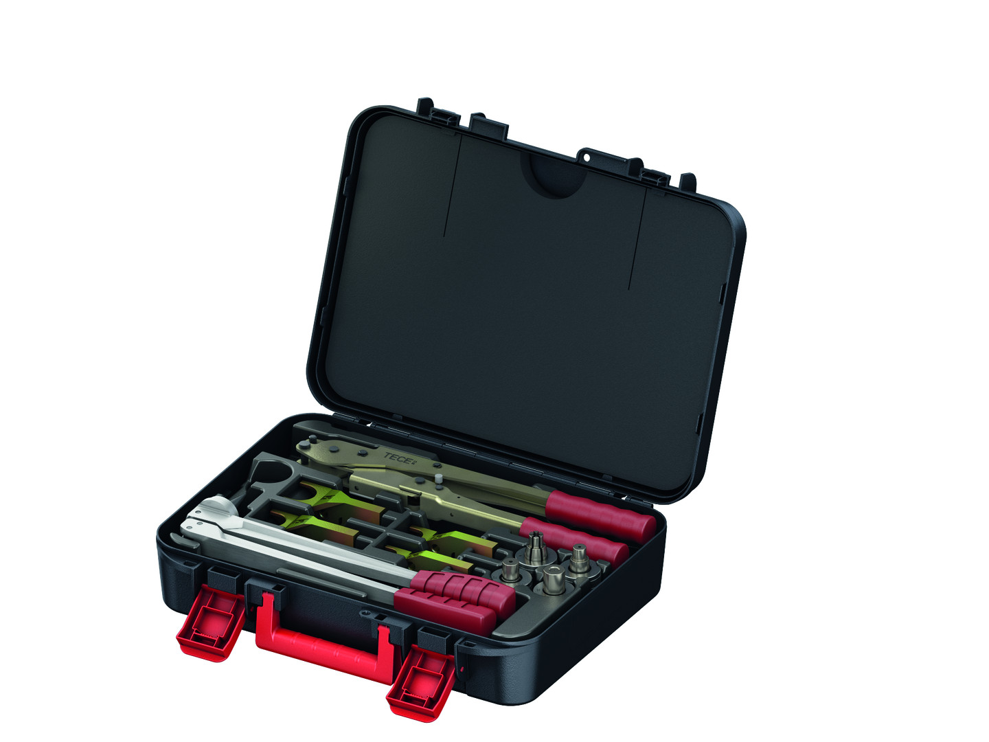 bestehend aus TECEflex Rohraufweitzange manuell, Aufweitköpfe Dim. 16-32 mm, TECEflex Druckhülsen-Presswerkzeug manuell, Gabelköpfe Dim. 14-32 mm, Werkzeugkoffer