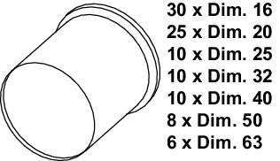 Nachfüllpackung Inhalt besteht aus 30 x Verschlüsse für Stutzen Dim. 16, 25x Verschlüsse für Stutzen Dim. 20, 10 x Verschlüsse für Stutzen Dim. 25, 10 x Verschlüsse für Stutzen Dim. 32, 10 x Verschlüsse für Stutzen Dim. 40, 8x Verschlüsse für Stutzen Dim. 50, 6x Verschlüsse für Stutzen Dim. 63