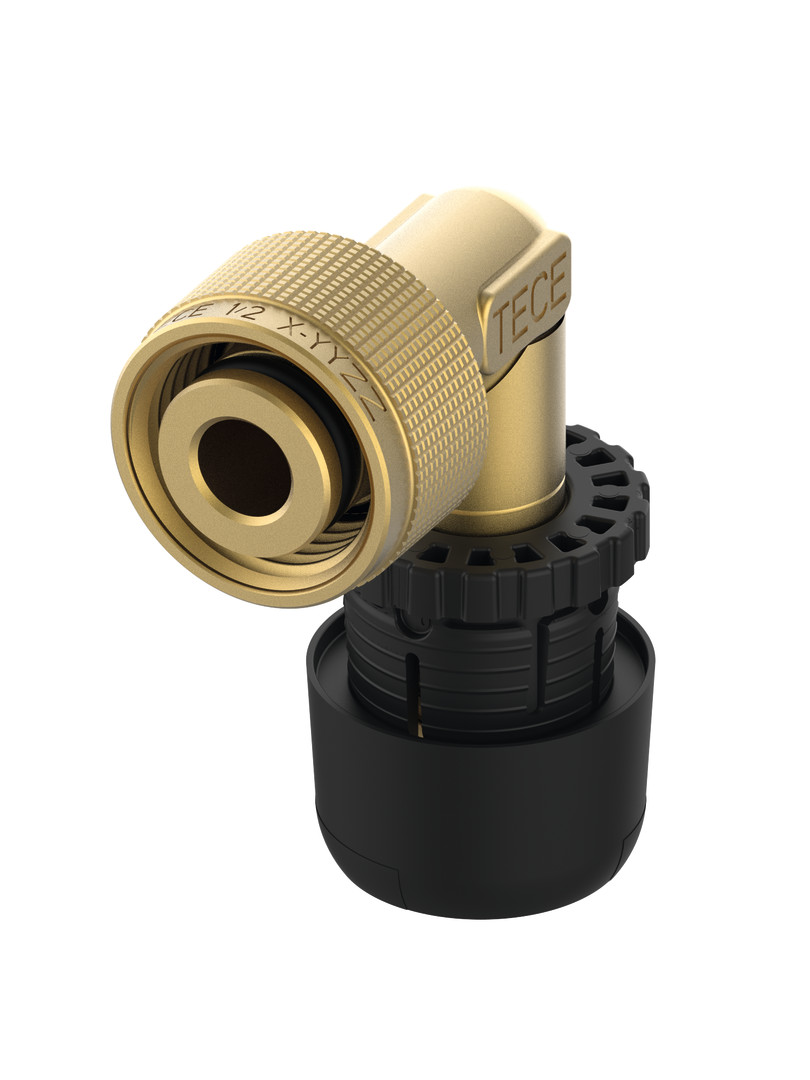 Schnelladapter zum werkzeuglosen Anschluss von verpressten TECElogo Rohren mittels logo-Ax Verbinder an einen 1/2" Schnellanschluss, die Spülkästen sind mit kompatiblen Schnellanschlüssen ausgestattet